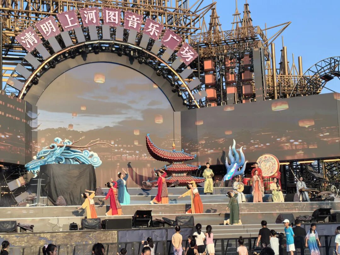 移步至“清明上河图音乐广场”,一场融合现代科技与古典意蕴的盛大演出正在上演。大家在观看节目的同时也都参与到了其中的活动。