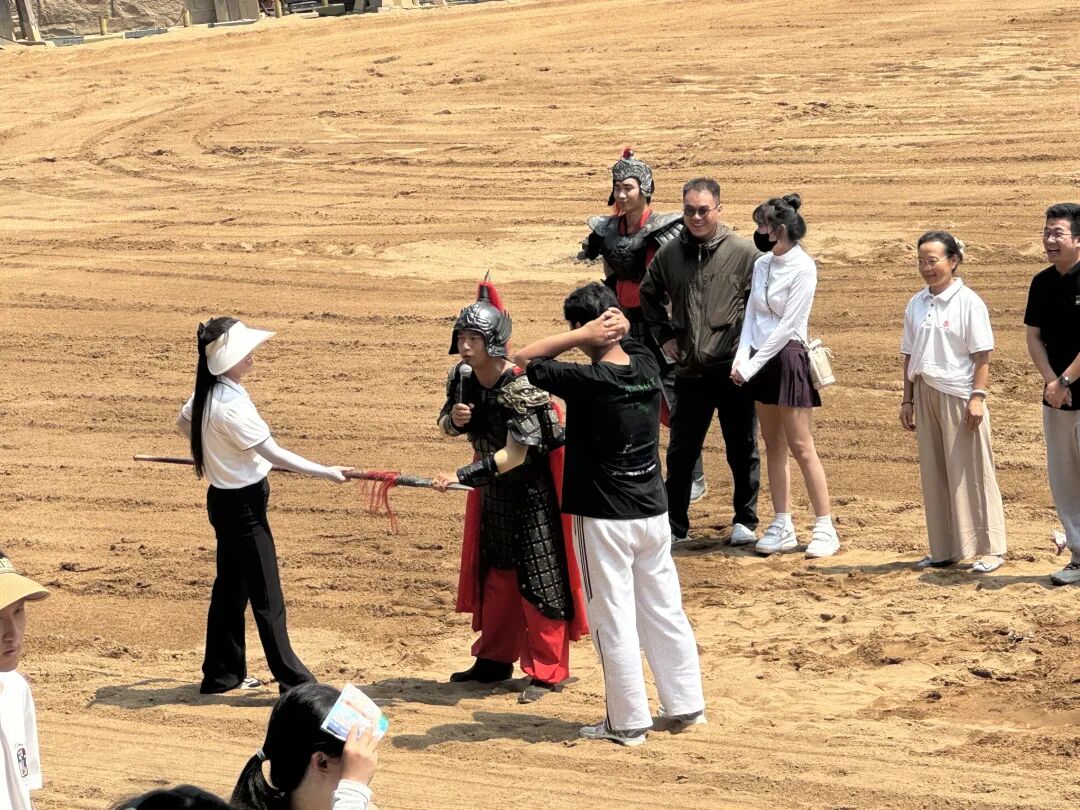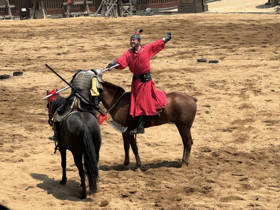 岳飞枪挑小梁王,英姿飒爽:在开阔的沙地演武场,我们被一场惊心动魄的古代马战深深吸引。骏马奔腾,沙尘微扬,身着铠甲的武士或激昂怒吼、或持枪对峙,动作矫健,气势如虹!更有我们的朋友们,在现场被邀请上台,与“将军”互动,共同执起象征性的长杆道具,体验了一把“古代沙场”的豪情,引得大家欢笑连连,掌声不断。