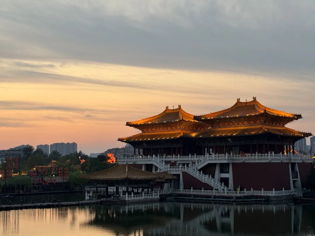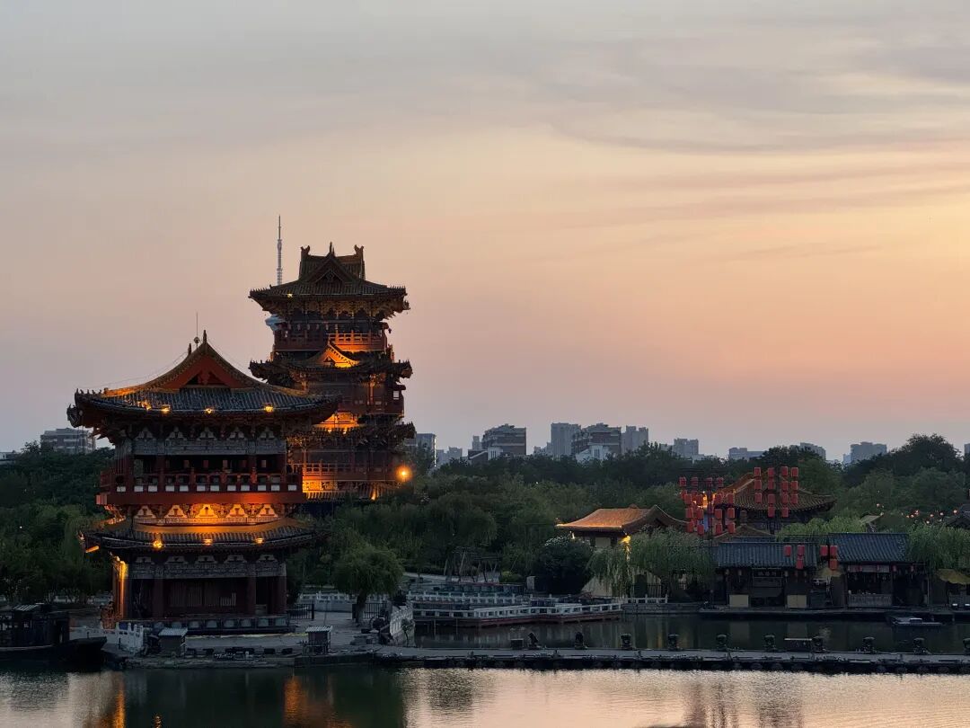 楼阁夕照,梦回汴水:傍晚时分,夕阳的余晖温柔地洒满园区。金色的琉璃瓦与朱红梁柱交相辉映,华美的楼阁临水而立,倒影在静谧的河面上。天边渲染着梦幻般的粉橙与淡紫,古建与暮色构成了一幅绝美的画卷。“人在画中游”,此刻的清明上河园,恍若真正还原了《清明上河图》中最令人沉醉的汴京盛景。看到如此美景大家纷纷掏出手机拍照记录互相分享。