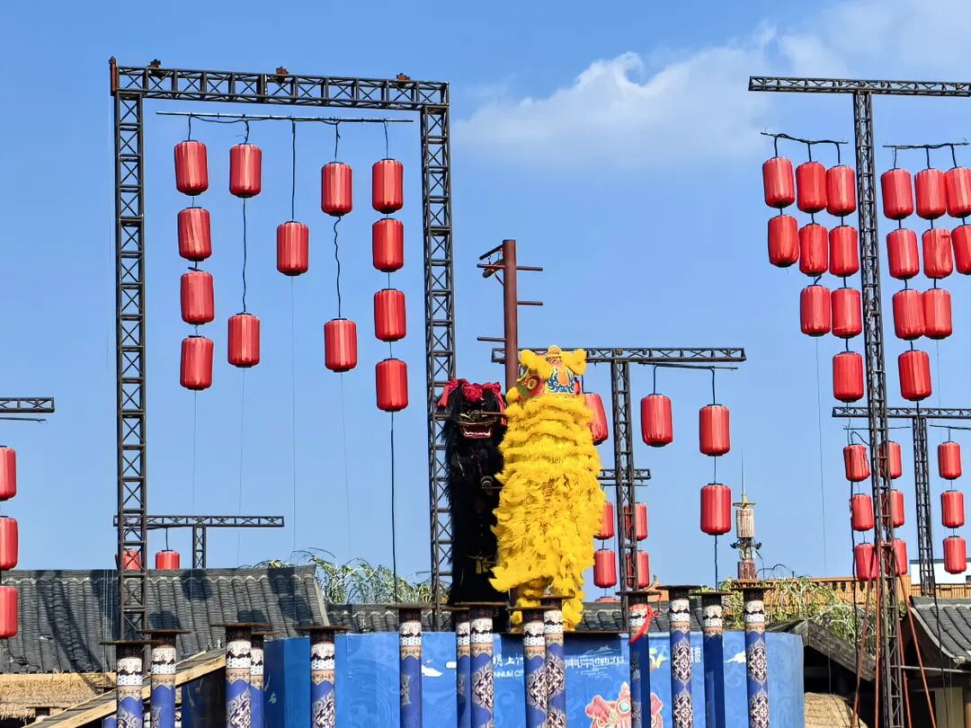 民俗欢腾,热闹非凡:园中喜庆的锣鼓声传来,色彩鲜艳的《雄狮争霸》踏着整齐的步伐在高耸的立柱上跳跃腾挪,黄狮灵动,黑狮威武,矫健的身姿伴随着震天的喝彩,将欢乐祥和的节日气氛推向高潮!